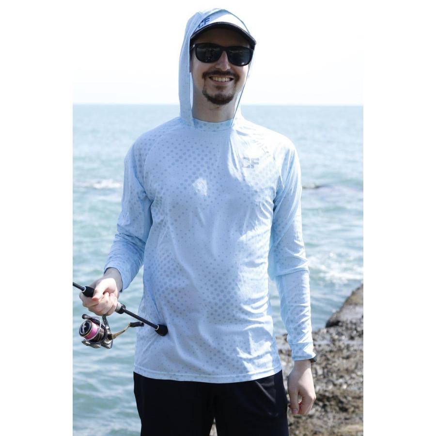 Защитите себя от солнца и жары с худи CF, чтобы продолжать рыбалку столько, сколько вам нужно. Тончайшая дышащая ткань из 100% полиэстера отводит влагу от кожи и пропускает внутрь воздух, охлаждая тело. Максимальная защита UPF 50+ блокирует 99% ультрафиолетовых лучей, которые могли бы попасть на вашу кожу и защищает от солнечных ожогов. Ловите в самый зной с берега и лодки, а любой, даже очень слабый поток воздуха будет проходить сквозь ткань и охлаждать. Капюшон защитит голову и шею от прямых солнечных лучей, поэтому вы сможете ловить весь световой день. А специальные вставки из более тонкой ткани в области подмышек и на капюшоне помогут еще эффективнее отводить влагу и охлаждать вас.