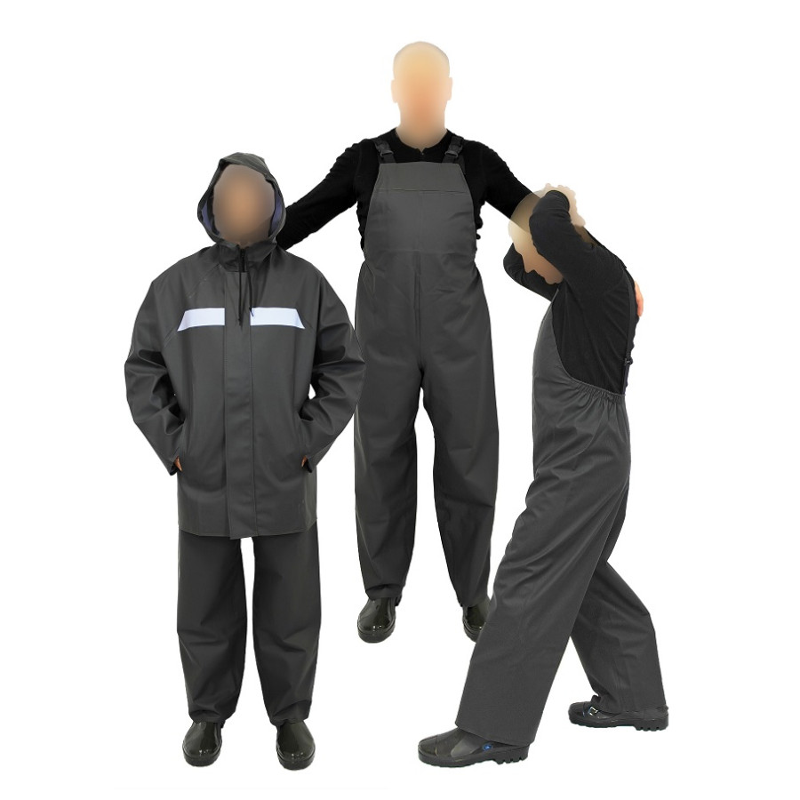 Костюм защитный специальный из винилискожи искусственной. Куртка, полукомбинезон без сапог. Костюм предназначен для защиты от воды, нефтепродуктов, растворов кислот концентрации до 50%, растворов щелочей концентрации до 50%. Куртка прямого силуэта без боковых швов, с центральной застежкой на молнию, закрытую ветрозащитной планкой. Планка фиксируется кнопками. Полочка с прорезными карманами с клапаном, спинка на кокетке с вентиляционными отверстиями. Горловина с капюшоном. Полукомбинезон без боковых швов. Бретели из ременной тесьмы при помощи карабина и пряжки пристегиваются к тесьме эластичной, пришитой спереди к нагруднику и сзади к верхнему срезу. Соединительные швы костюма выполняются методом сварки током высокой частоты и комбинированным ниточно-сварным швом.