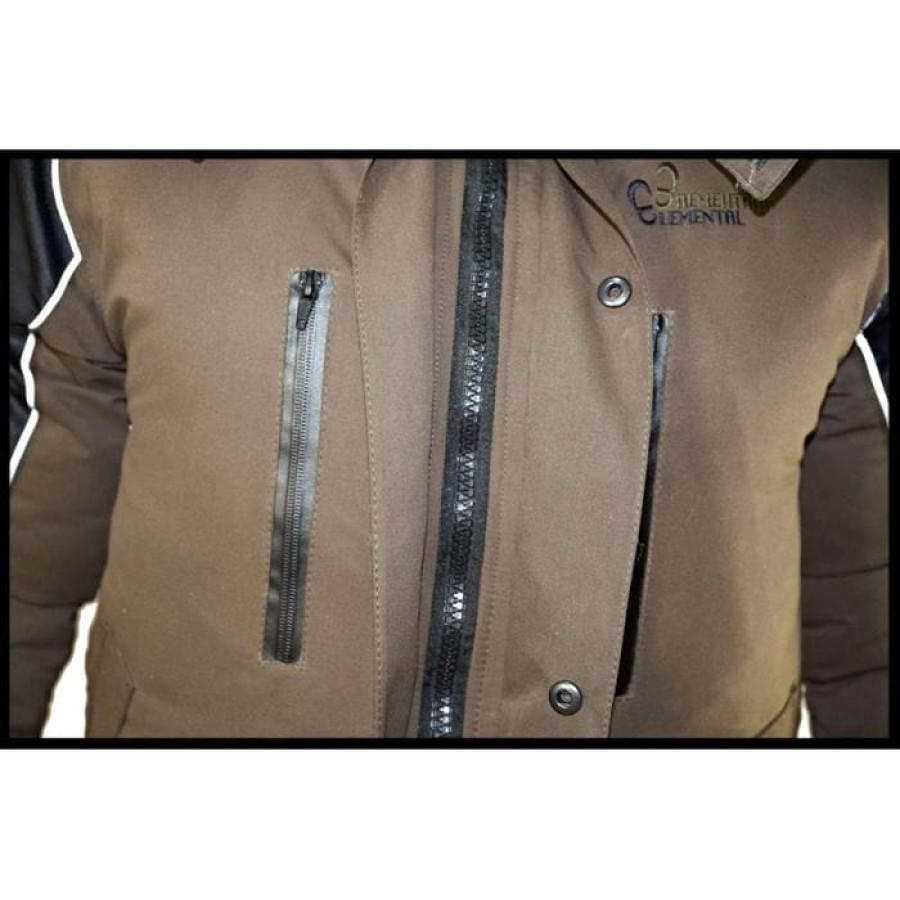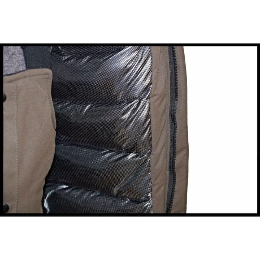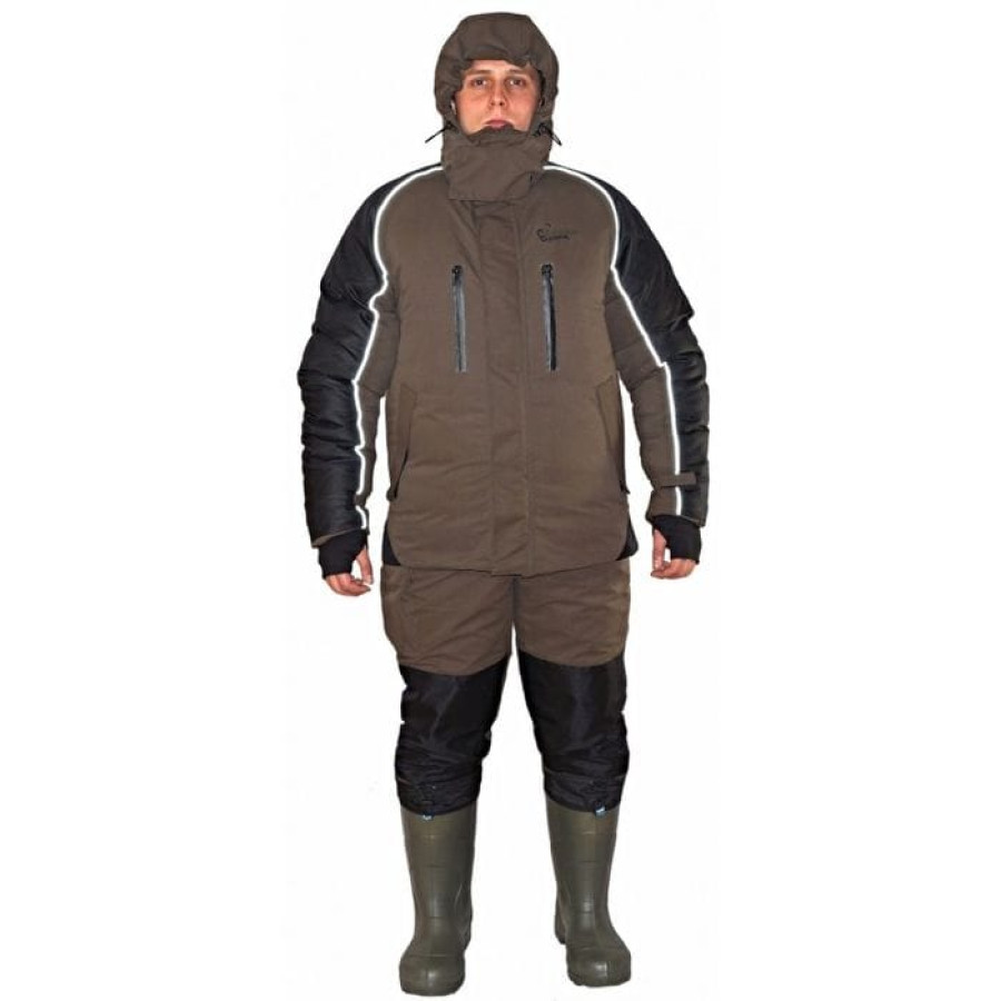 Куртка: Прямого свободного кроя, два боковых кармана с клапаном на молнии, два нагрудных кармана с влагозащитными молниями, внутренний карман для документов, объемный отстегивающийся капюшон, регулировка объема капюшона утяжкой с фиксаторами. Двойная ветрозащитная планка, подкладка из термофольги, воротник утеплен флисом, внутренние трикотажные манжеты с отверстием для большого пальца, дополнительная фиксация манжет липкой лентой, утеплитель силиконизированный "Лебяжий пух", центральная тракторная молния с легким ходом, контрастная отделка, светоотражающий кант.
