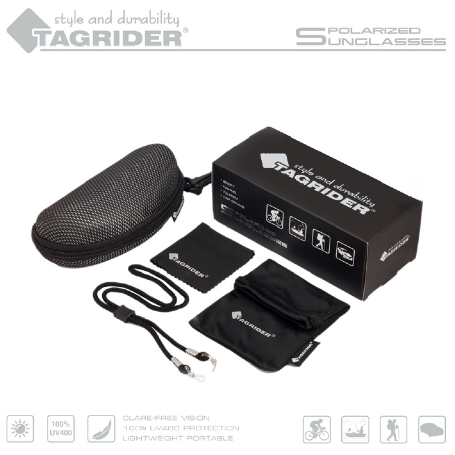 Поляризационные очки Tagrider оснащены прогрессивным 400 UV фильтром защиты от ультрафиолетового излучения, что позволяет полностью убрать негативное воздействие света на глаза и использовать их на солнце с любой интенсивностью. Прогрессивный светофильтр сохраняет всю гамму цветов предмета и усиливает свое действие с увеличением интенсивности света. Стекла с многослойной поляризацией снимают блики с любых отражающих поверхностей и делают изображение более чётким. Затылочный держатель с фиксатором, предотвратит падение и обеспечит надежную посадку очков даже при активном движении или занятии спортом. Очки выполнены из гипоаллергенного ударопрочного полимера марки ABS. В комплекте специальная карточка для проверки поляризации очков