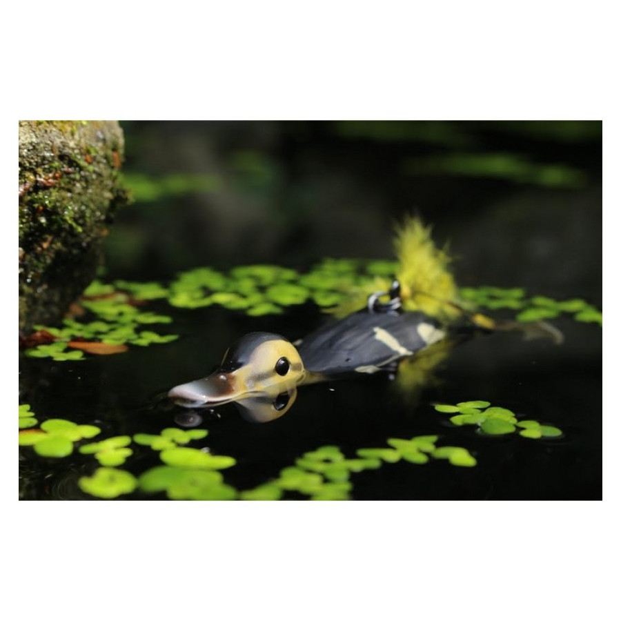 Вращающиеся лапки придают приманке игру, очень похожую на плескание настоящего утенка, перебирающего своими лапками, и оставляют хорошо заметный след из пузырьков, способный завлечь любого хищника с большой дистанции. Для ловли на открытой воде оснащена двумя обмотанными перьями тройниками (один на груди, второй на спине). Это позволяет увеличить шансы на удачную подсечку во время атаки. Для ловли на густо заросших участках, просто снимите тройник расположенный на груди. Приманка разработана таким образом, чтобы всегда приводняться на «живот».