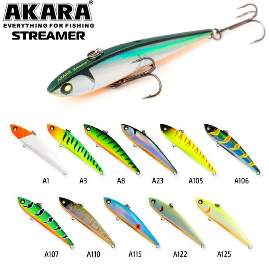 Воблер раттлин Akara Streamer 90 мм 19 гр - безлопастный воблер класса раттлин (rattlin). Приманка с прогонистой формой тела предназначена для отвесной ловли судака и окуня, а также других хищных рыб. Стабильно работает на водоемах любого типа, отлично держит сильное течение, не входит в штопор. Высокочастотная игра привлекает рыбу с дальних дистанций. Тип плавучести - быстротонущий.