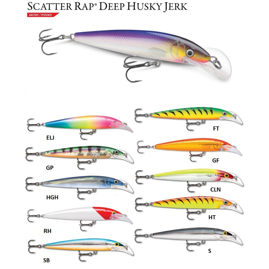 Воблер Rapala Scatter Rap Deep Husky Jerk в версиях с полупрозрачным корпусом оформлен с использованием голографических элементов, которые улучшают визуальный контакт с потенциальной добычей. Больше двадцати вариантов расцветок позволяют подобрать минноу под любые условия лова. В палитре различные сочетания натуральных оттенков, которые быстро обратят внимание хищника в чистой воде. Большое количество версий с разнотональными сочетаниями кислотных расцветок обеспечивают возможность выбора для условий с недостатком видимости.
