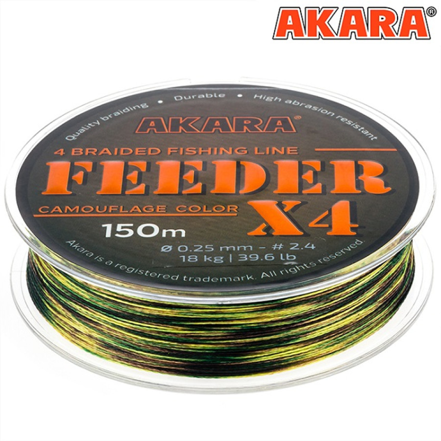 Feeder X-4 – всесезонный плетёный четырехжильный рыболовный шнур предназначенный для ловли на фидер. Шнур выпускается в комуфляжной расцветке, делающей шнур максимально незаметным в воде, что позволяет ловить даже самую осторожную рыбу. Изготовлен из современного плотного волокна японского производства. Материал обладает защитой от УФ излуче-ния, благодаря чему долго не теряет своих качеств. Шнур отличается высокой прочностью и надежностью, имеет круглую форму, абразивоустойчив и по-дойдет практически для любых условий лова, в том числе для ловли в местах, с непредсказуемым, каменистым и закоряженным дном. Не скручивается.