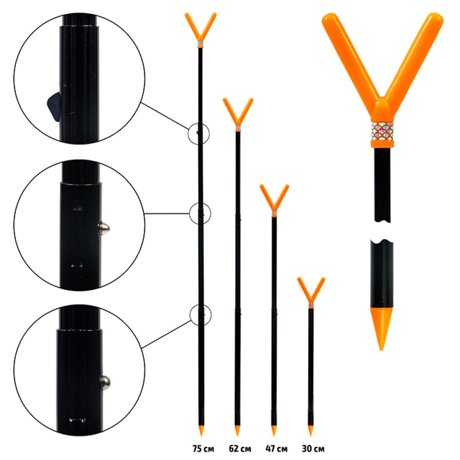 Четырехколенная телескопическая V-образная подставка для удочки. Разбирается на четыре длины: 30, 47, 62 и 75см. Подставка очень компактная и весит всего 67 грамм.