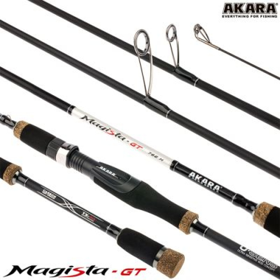 Спиннинг Akara Magista GT (21-62) – джиговый тубулар спиннинг средне-быстрого строя, новинка 2020-го года. Это обновленная линейка уже зарекомендовавших себя спиннингов Akara Magista, исполнена с использованием современных технологий. Cпиннинги собраны на основе бланка из высокомодульного карбона TX-30 (40-ton) производства Японско-го концерна Toray. При производстве используется современная технология UPIT (Under Pressure Innovative Technology) при которой бланк спиннинга накатывается под давлением в термической камере. Использование данной технологии позволяет создать бланки с минимальным количеством связующего вещества и высокой плотности скручивания. Это делает спиннинги звонкими, чувствительными, при полном сохранении прочностных характеристик. Катушкодержатель имеет эргономичную форму, выполнен из высокопрочного пластика, что исключает люфты при установке катушки и обеспечивает удобный и надежный хват во время ловли. Данные спиннинги оснащены облегченными кольцами из оксида циркония Kujira XR Long Super Hard ZrO2 (1600-1800H, kg/mm2) расставленными по технологии New Guide System, которая позволяет оптимально расположить кольца на бланке, определить их количество и размер (вес). Подходит как для ловли с лодки, так и с берега.