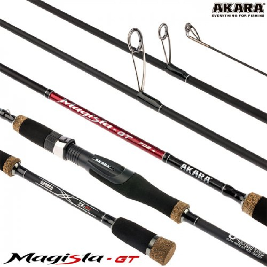 Спиннинг Akara Magista GT (2,5-11) - джиговый спиннинг средне-быстрого строя с вклеенной вершинкой (солид), новинка 2020-го года. Это обновленная линейка уже зарекомендовавших себя спиннингов Akara Magista, исполнена с использованием современных технологий. Cпиннинги собраны на основе бланка из высокомодульного карбона TX-30 (40-ton) производства Японско-го концерна Toray. При производстве используется современная технология UPIT (Under Pressure Innovative Technology) при которой бланк спиннинга накатывается под давлением в термической камере. Использование данной технологии позволяет создать бланки с минимальным количеством связующего вещества и высокой плотности скручивания. Это делает спиннинги звонкими, чувствительными, при полном сохранении прочностных характеристик. Катушкодержатель имеет эргономичную форму, выполнен из высокопрочного пластика, что исключает люфты при установке катушки и обеспечивает удобный и надежный хват во время ловли. Данные спиннинги оснащены облегченными кольцами из оксида циркония Kujira XR Long Super Hard ZrO2 (1600-1800H, kg/mm2) расставленными по технологии New Guide System, которая позволяет оптимально расположить кольца на бланке, определить их количество и размер (вес). Подходит как для ловли с лодки, так и с берега.