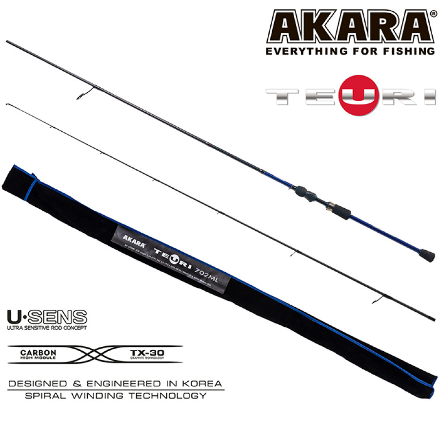 Обновление в модельном ряду угольных спиннингов от Akara - серия Teuri. В линейке представлены, как спиннинги для ультра-лайта, так и удилища для тяжелого джига (heavy jig). Благодаря использованию графита концерна Toray TX-30 (40-ton) и инновационным технологиям плетения бланка спиннинг обладает повышенной чувствительностью при проводке, что делает его незаменимым при контактных видах ловли: джиг, твич, ловля на техасскую оснастку и с отводным поводком. При производстве бланка спиннинга использована технология UPIT. Расстановка колец произведена по технологии New Guide System, позволяющая оптимально расположить кольца на бланке, определить их количество и размер (вес). Облегчённые кольца Kujira XR Long Super Hard ZrO2 (1600-1800H, kg/mm2).