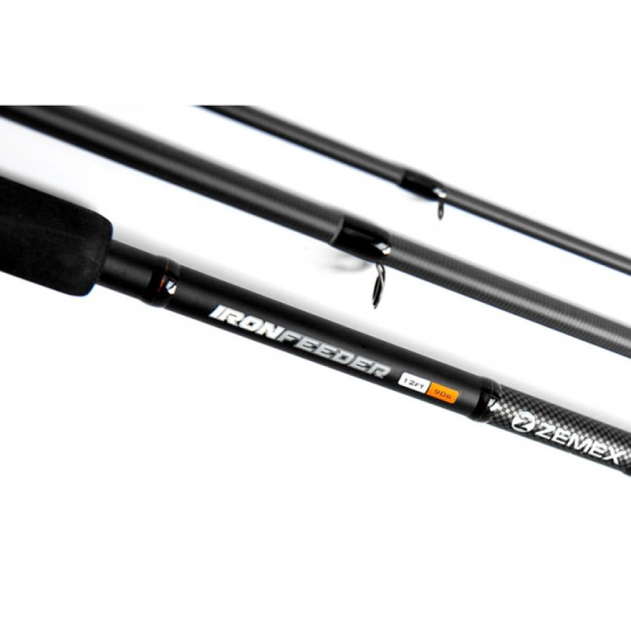 ZEMEX IRON Feeder 12ft – 70g Удилище класса medium с тестом 70g. Вес фидера 215g при длине 3.60m. Это трехчастная модель с комплектом карбоновых квивертипов: 1, 1.5 и 2.5oz с посадочным диаметром 2.3mm. В сет направляющих фидера входит 9 колец, первое из которых #20. Транспортировочная длина 128cm. Диапазон комфортных тестов оснасток для этой модели 20 - 40g, оптимальная дистанция ловли 20 - 40m.Это удилище, отлично подойдет для ловли на средних дистанциях, его смело можно назвать «рабочей лошадкой» в арсенале любителя фидерной ловли. Удочка обладает быстрым строем и хорошим балансом и позволяет совершать точные акцентированные забросы в точку ловли. Оптимально подойдет, как для ловли некрупной белой рыбы, так и для упитанных лещей и карпов.