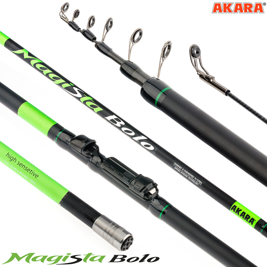 Magista Bolo - серия болонских (с кольцами) удилищ. Данная серия представлена тремя типоразмера-ми 4,00 м, 5,00 м и 6,00 м с диапазоном тестов 15-40 грамм. Удилища относятся к классу компакт. Удилища Akara Magista Bolo выполнены из высокомодульного карбона TX-30 (40-ton) производства Японского кон-церна Toray. Удилища оснащены облегченными кольцами из оксида циркония Kujira XR.