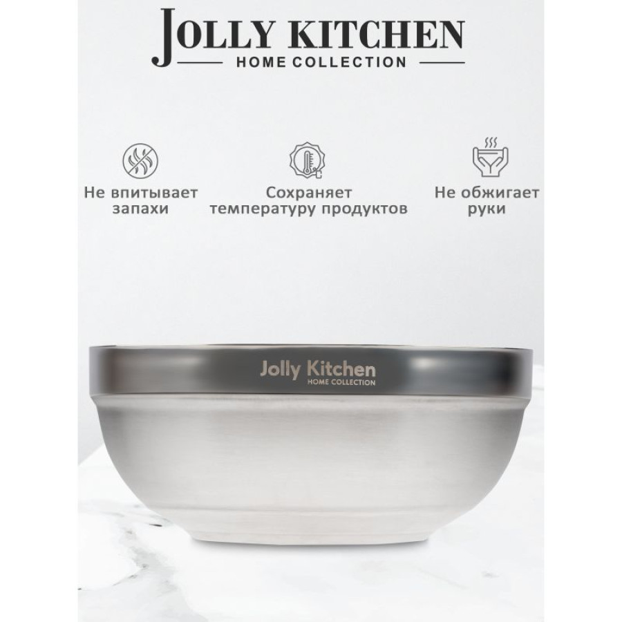 Кухонная миска Jolly Kitchen с двойными стенками – стильный и практичный аксессуар с зеркальной полировкой. Благодаря изотермическим свойствам сохраняет температуру содержимого и не обжигает руки, что идеально для горячих блюд и пикников. Выполнена из прочного металла, не впитывает запахи – подходит для маринования и хранения продуктов. Удобна для смешивания ингредиентов, нарезки овощей и сервировки. Можно мыть в посудомоечной машине. Ограничения: не подходит для СВЧ, плит и открытого огня. Элегантный дизайн делает её прекрасным подарком и украшением кухни.