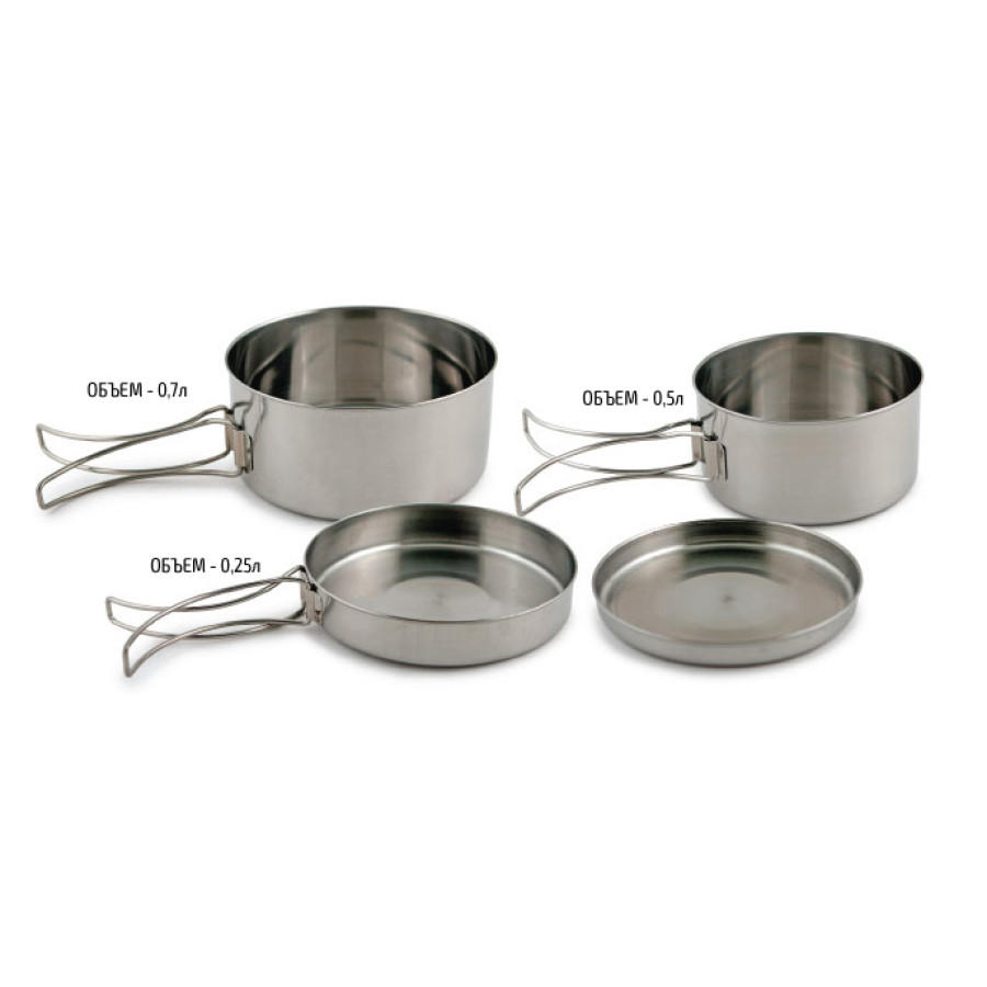 Набор посуды выполнен из высококачественной нержавеющей стали, не подвержен окислению и ржавчине. Обладает химической нейтральностью к любым продуктам. Набор используется для приготовления пищи на газовых и бензиновых горелках. Компактно складывается.