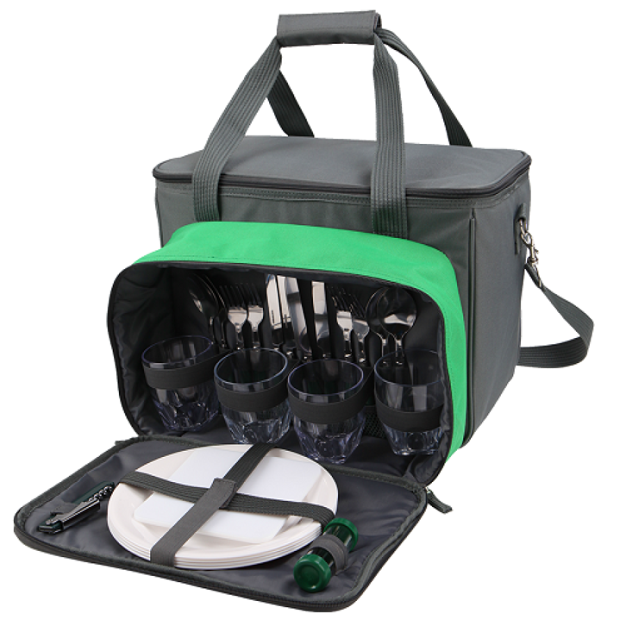 Сумка-холодильник (24,5 л) , стакан 4 шт, вилка 4 шт, ложка 4 шт, нож 4 шт, тарелка 4 шт, солонка-перечница 1 шт, штопор 1 шт, разделочная доска 1 шт.