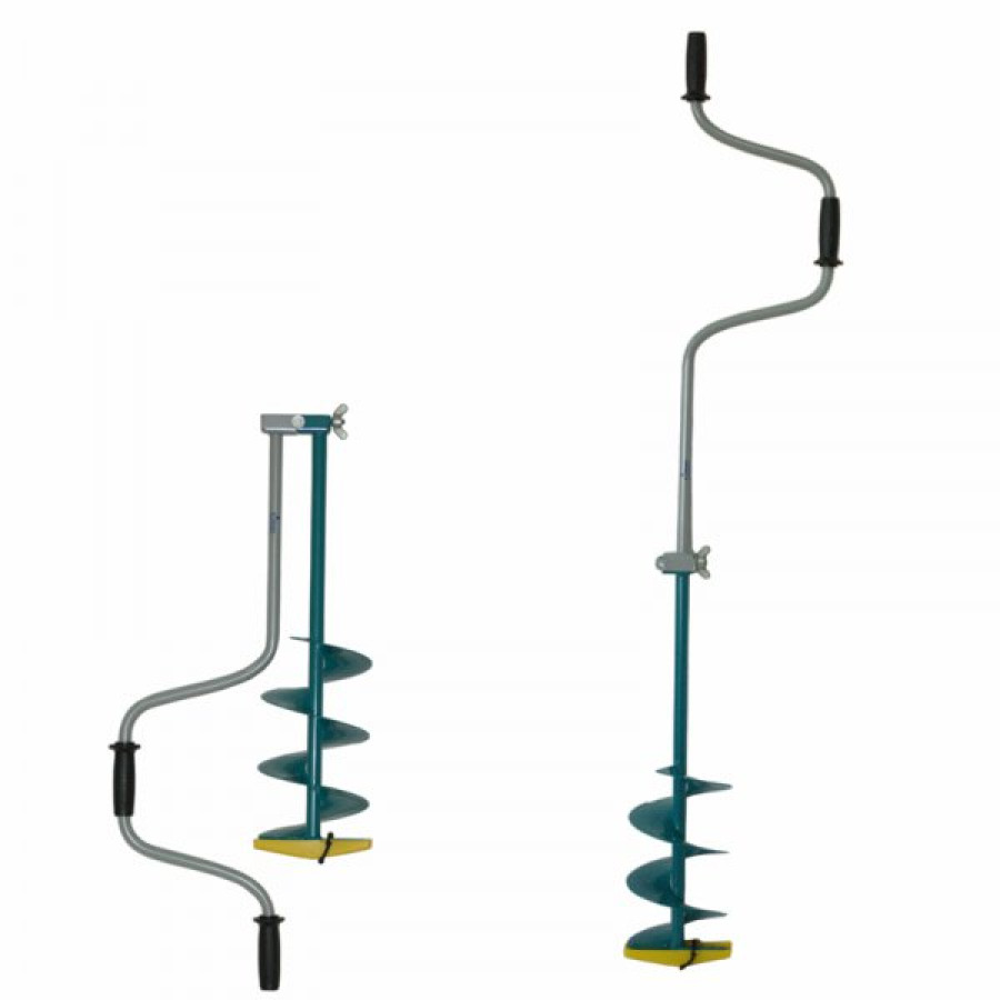 Барнаульский двуручный ледобур. Основное и единственное отличие двуручных ледобуров от классических – верхняя рукоятка ледобура смещена относительно оси ледобура на 130 мм, а нижняя на 150 мм. Такое расположение рукояток позволяет вращать ледобур одновременно двумя руками, тем самым, увеличивая скорость бурения лунок во льду. Кроме того, существенно уменьшаются габариты ледобура в транспортном положении.
