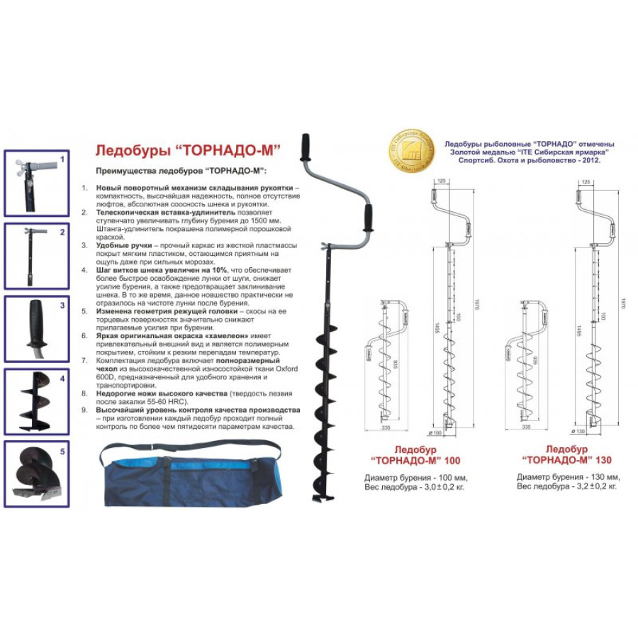 Ледобур ТОРНАДО-М2 - это модернизированный вариант уже хорошо зарекомендовавшего себя ледобура "ТОРНАДО-М" c левым вращением. Главное новшество в ледобуре - это усиленный винт-барашек с измененным шагом резьбы на деталях замка, что позволило полностью решить проблему с самопроизвольным откручиванием барашка и ослаблением замка.