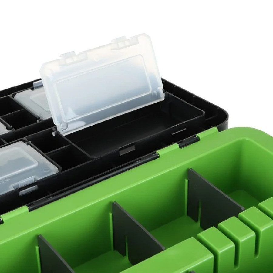 Благодаря объему 19 литров, ящик вместит очень много полезных снастей для рыбалки. Дополнительная проставка с 2 отсеками и съемными перегородками позволяет разместить небольшие удочки и другие снасти.
